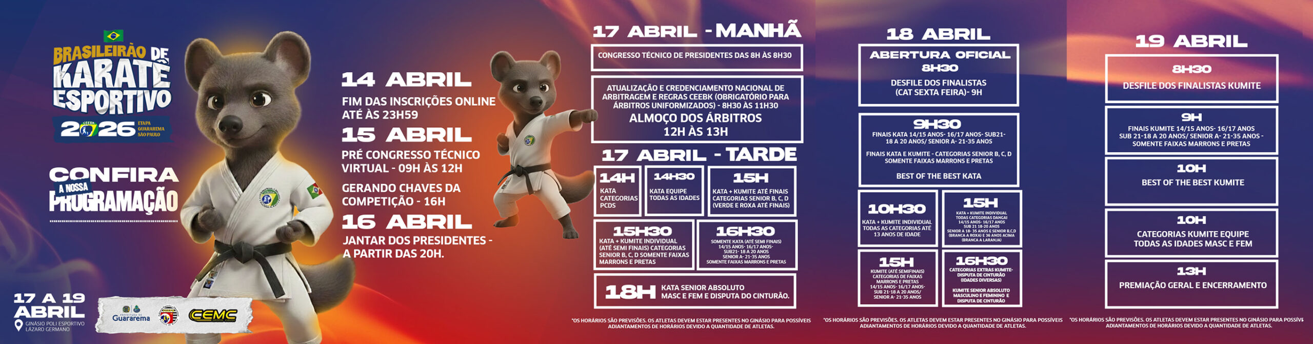 1ª Etapa do BRASILEIRÃO DE KARATE ESPORTIVO 2026, que será realizada de 17 a 19 de Abril de 2026 no Ginásio Poli esportivo “Lázaro Germano” sito Rua José Ramires nº 160- bairro Ipiranga- Guararema SP.