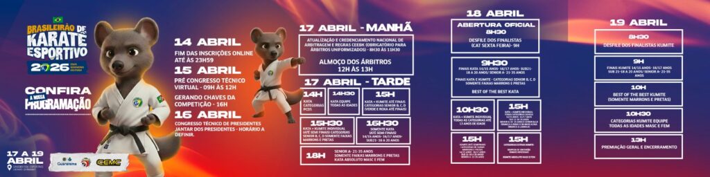 • O evento de competição inicia-se oficialmente na sexta feira dia 17 de abril a partir de 14hs e tem término previsto para domingo dia 19 de Abril até as 15hs, devendo para tanto, estarem atletas e delegações disponíveis neste período para qualquer eventualidade, bem como mudança de cronograma devidamente anunciado junto as presidências das federações estaduais.